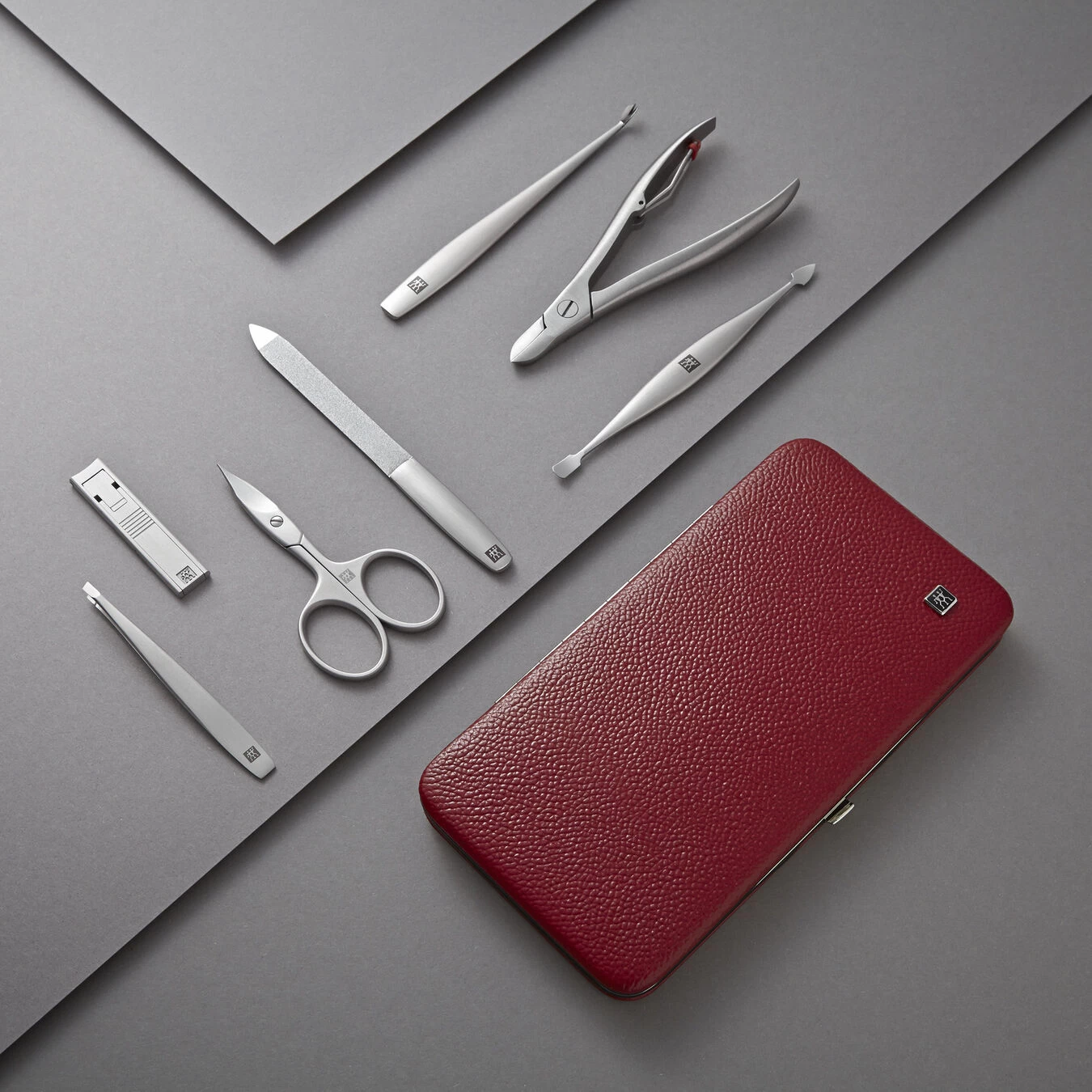 El práctico estuche con boquilla de la serie de manicura TWNOX® de ZWILLING contiene un juego de manicura de siete piezas: unas tijeras combinadas de uñas, una lima de uñas, un instrumento doble, una cuchilla de pieles, unos alicates de pieles, pinzas y un cortaúñas. Todas las herramientas tienen un acabado mate y son resistentes a la corrosión. Este set asegura una uñas siempre perfectas: las tijeras y la lima sirven para cortar y dar forma a las uñas, mientras que la cuchilla de pieles y el instrumento doble limpian y cuidan de las cutículas alrededor de las uñas. El resistente estuche de cuero rojo muestra el típico grabado de la piel.