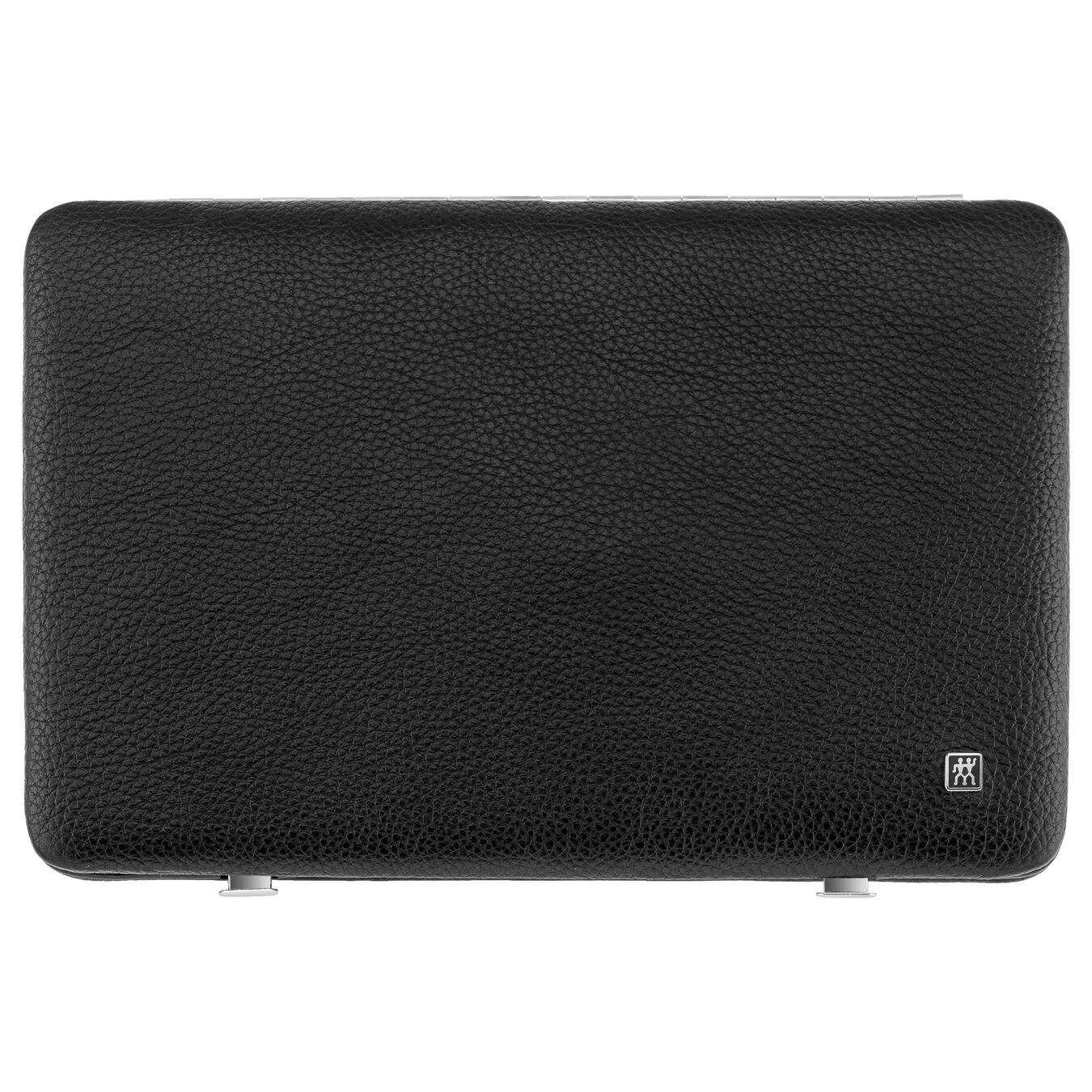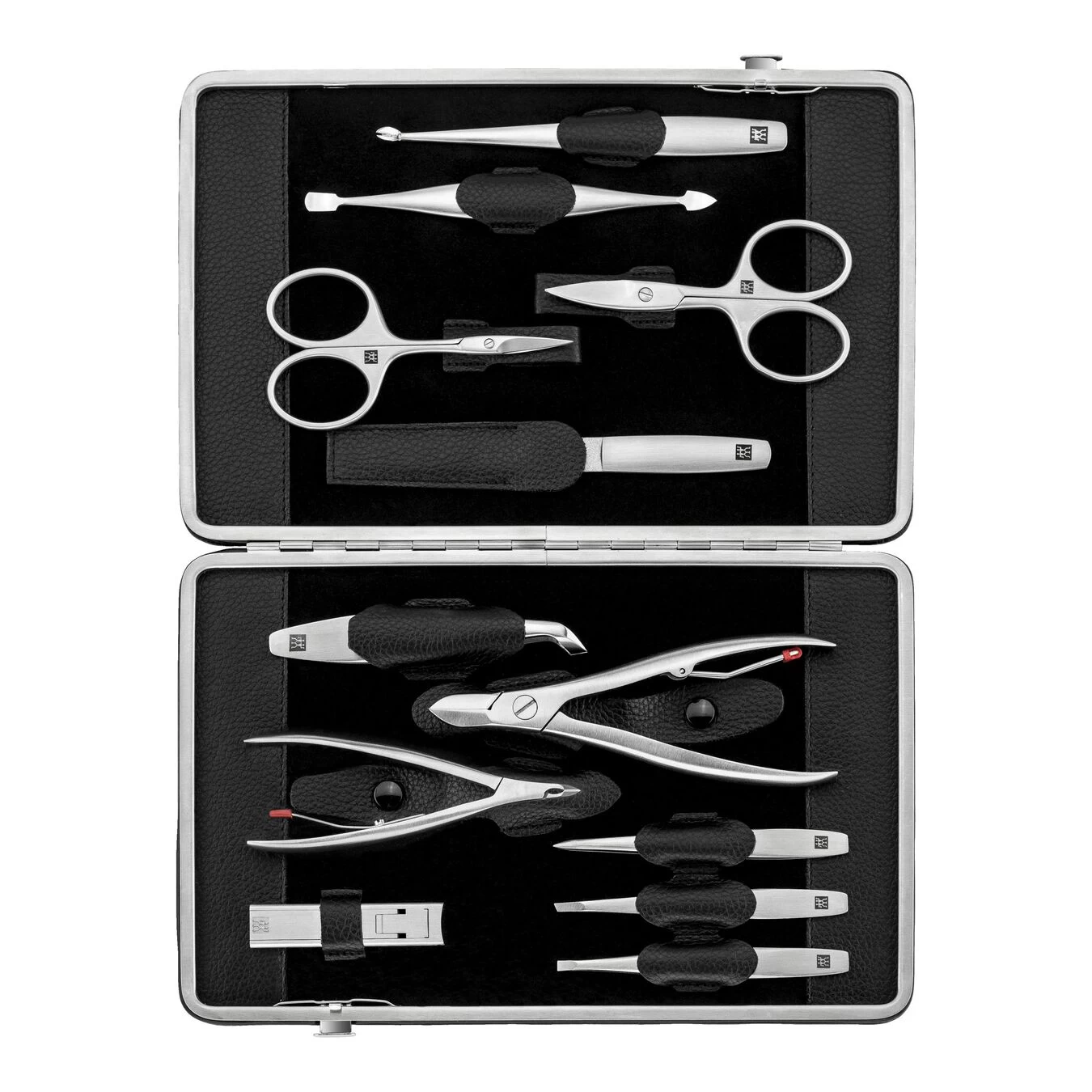 Con este estuche de manicura con boquilla ZWILLING disfrutará del aseo personal en su hogar o cuando se encuentre de viaje. El juego de 12 piezas contiene todo lo necesario para el cuidado de las uñas y las cutículas, como alicates y tijeras de uñas. Con ellos podrá cortar sin esfuerzo las uñas de las manos y las más duras de los pies. El estuche le ofrece además alicates para pieles, el nuevo alicate para pieles con forma de pinza, pinzas y otros utensilios. Todos los instrumentos son de acero inoxidable mate, de forma que pueden guardarse en el cuarto de baño sin inconveniente. La excelente calidad de este juego no sólo viene dada por las herramientas, sino también por el mismo estuche, fabricado con una refinada piel de color negro. El estuche mide 22 x 14,5 cm y destaca por la resistente, atractiva y brillante piel de becerro. Todos los instrumentos necesarios para la manicura y pedicura están en este estuche de la serie TWINOX® Manicure.